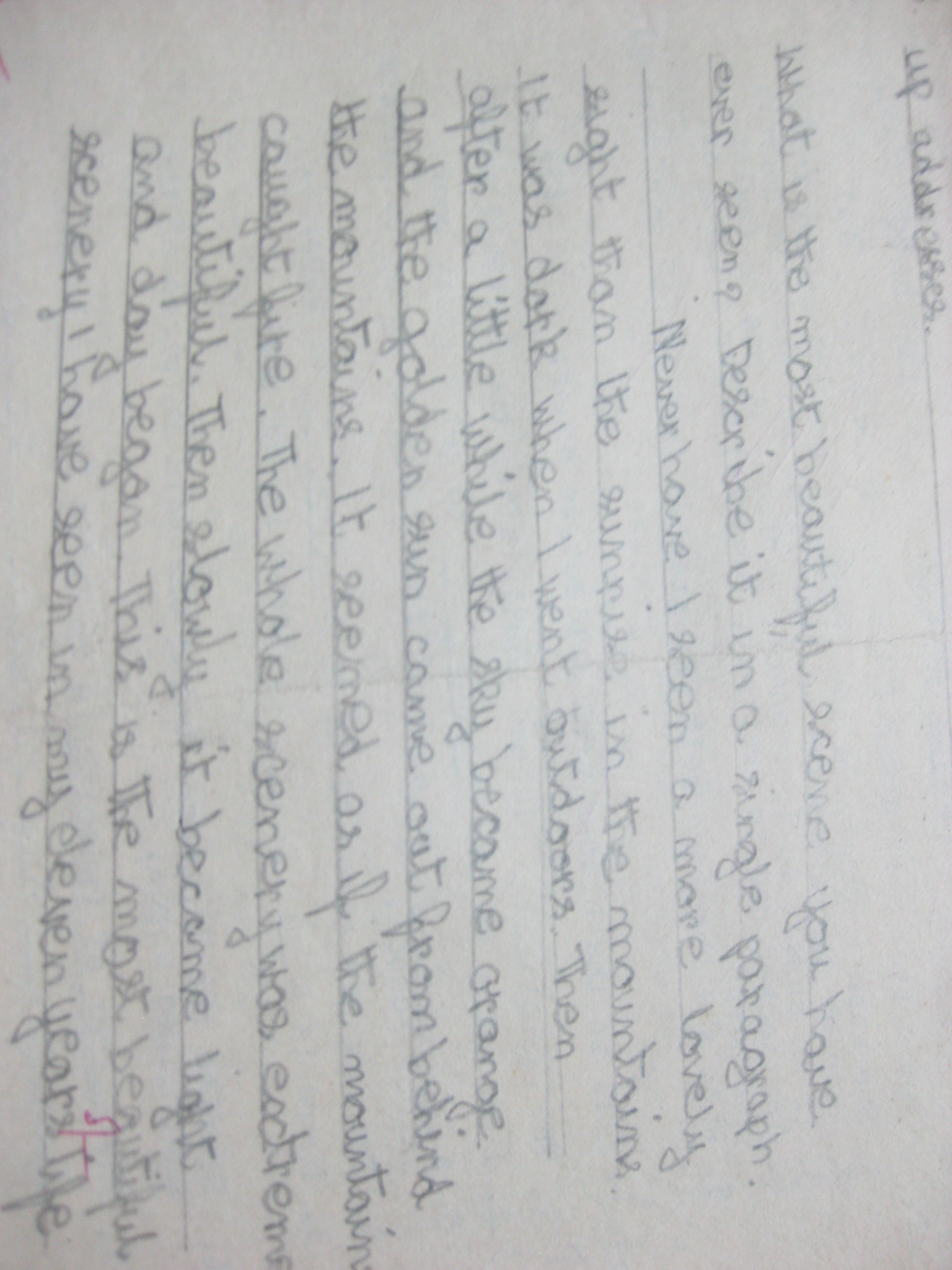 Never have I seen a more lovely sight than the sunrise in the mountains. It was dark when I went outdoors. Then after a little while the sky became orange and the golden sun came out from behind the mountains. It seemed as if the mountains caught fire. The whole scenery was extremely beautiful. Then slowly it became light and day began. This is the most beautiful scenery I have seen in my eleven years [] life.